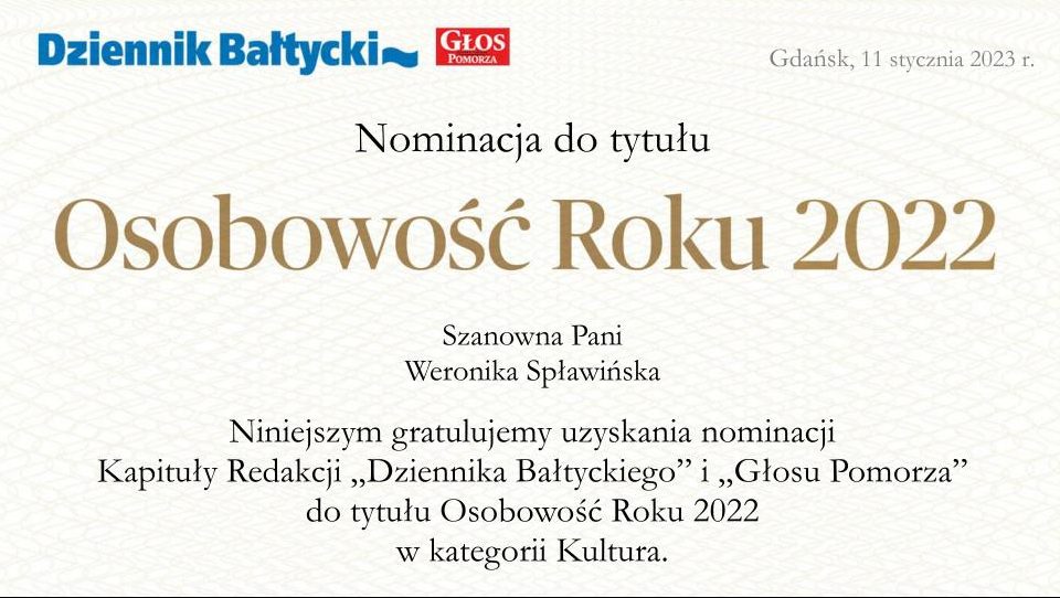 Jest nam ogromnie miło poinformować, że nasza uczennica – Weronika Spławińska /4A/ – została nominowana do tytułu Osobowość Roku 2022 w kategorii Kultura. Jak czytamy w liście przysłanym do szkoły, kapituła doceniła zwycięstwo Weroniki w konkursie plastycznym, zorganizowanym przez Narodowy instytut Fryderyka Chopina na wykonanie chopinowskiej kartki świątecznej.
