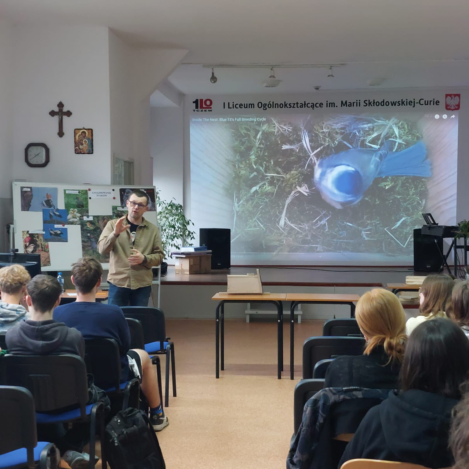 Dlatego zaprosiliśmy do szkoły ornitologa – pasjonata Pana Cezarego Wójcika, który opowiadał nam o gniazdowaniu ptaków i ich potrzebach w tym czasie.