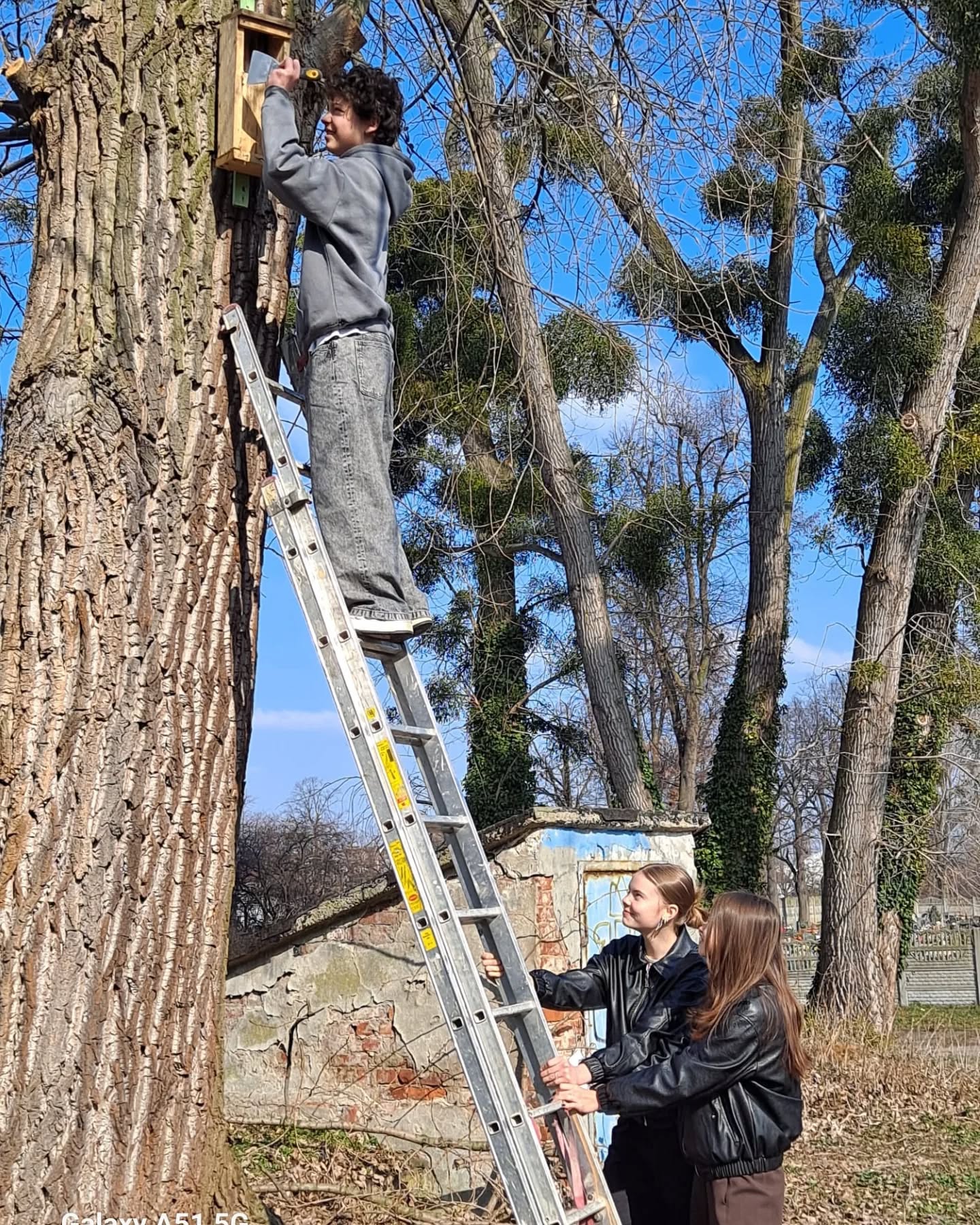 Nadeszła wiosna! 🌞🌱 Ptaki 🐦‍⬛też to czują i obwieszczają czas pobudki dla świata śpiewem. A my dziś z pomocą Pana Tomasza, wyczyściliśmy budki lęgowe dla ptaków. Budki były powieszone w zeszłym roku w ramach realizowanego projektu ekologicznego i niech służą dalej! Na terenie szkoły wisi🌳 osiem budek dla sikorek i szpaków 🐦🐦‍⬛ Trzymamy kciuki, żeby znalazły lokatorów także w tym roku!