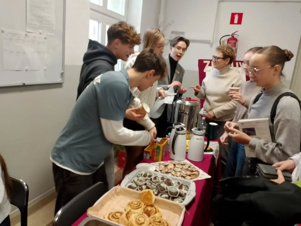 Na kiermaszu zorganizowanym przez Samorząd Uczniowski można było poczuć klimat Mikołajek, spróbować pyszności (ciasta, babeczki, cynamonki, herbata, czekolada), a także stworzyć własne kartki świąteczne!