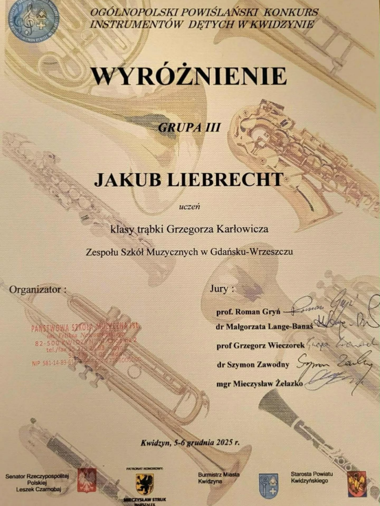 Z przyjemnością informujemy, że nasz uczeń Jakub Liebrecht (klasa 3d) zdobył wyróżnienie w Ogólnopolskim Powiślańskim Konkursie Instrumentów Dętych w Kwidzynie. Swój program konkursowy zaprezentował przed jury grając na trąbce następujące utwory: “Fantaisie Brillante” – Jean Bapitste Arban’a oraz “Sonatę G-moll” nr 1 – B. Marcello.