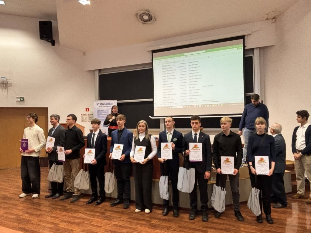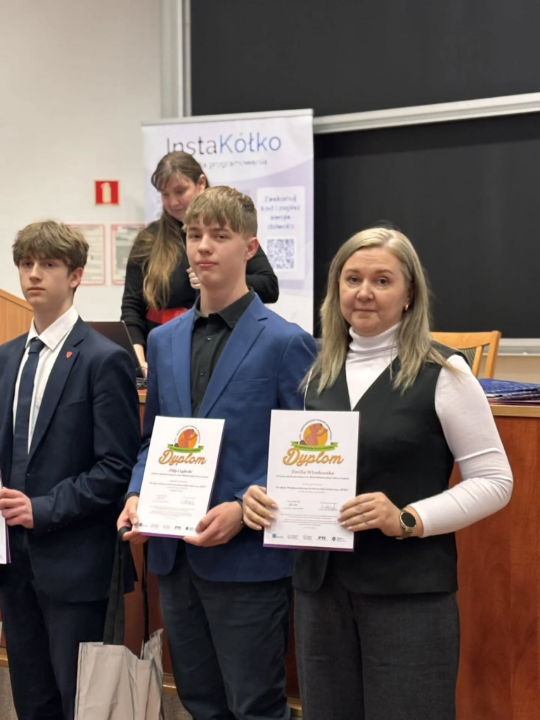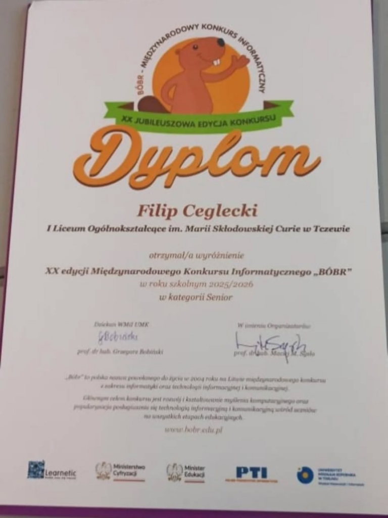 6 marca nasi uczniowie, pod opieką Pani Emilii Winsławskiej, wzięli udział w uroczystym zakończeniu XX edycji międzynarodowego konkursu Bóbr Informatyczny na Wydziale Matematyki i Informatyki UMK w Toruniu. Z dumą informujemy, że Filip Ceglecki z klasy 1d zdobył wyróżnienie – serdecznie gratulujemy! 👏💻