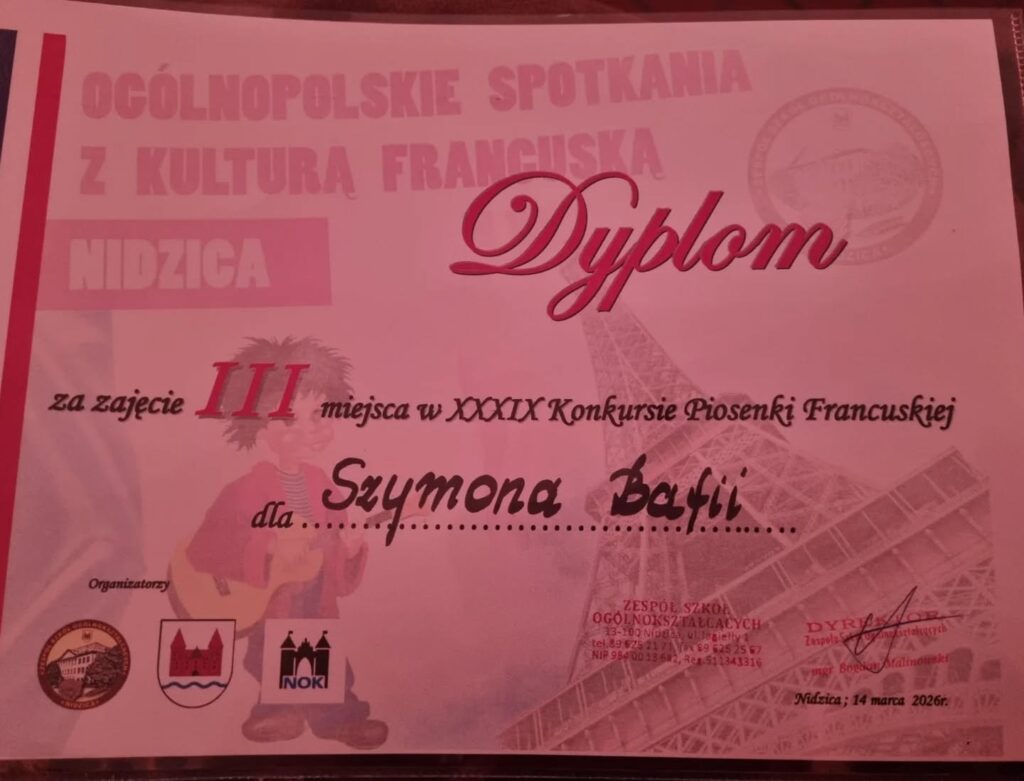 Z radością i ogromną dumą informujemy, że nasz uczeń, Szymon Bafia z klasy 3c, wyśpiewał III miejsce podczas 39. Ogólnopolskiego Finału Piosenki Francuskiej w Nidzicy! ![]()