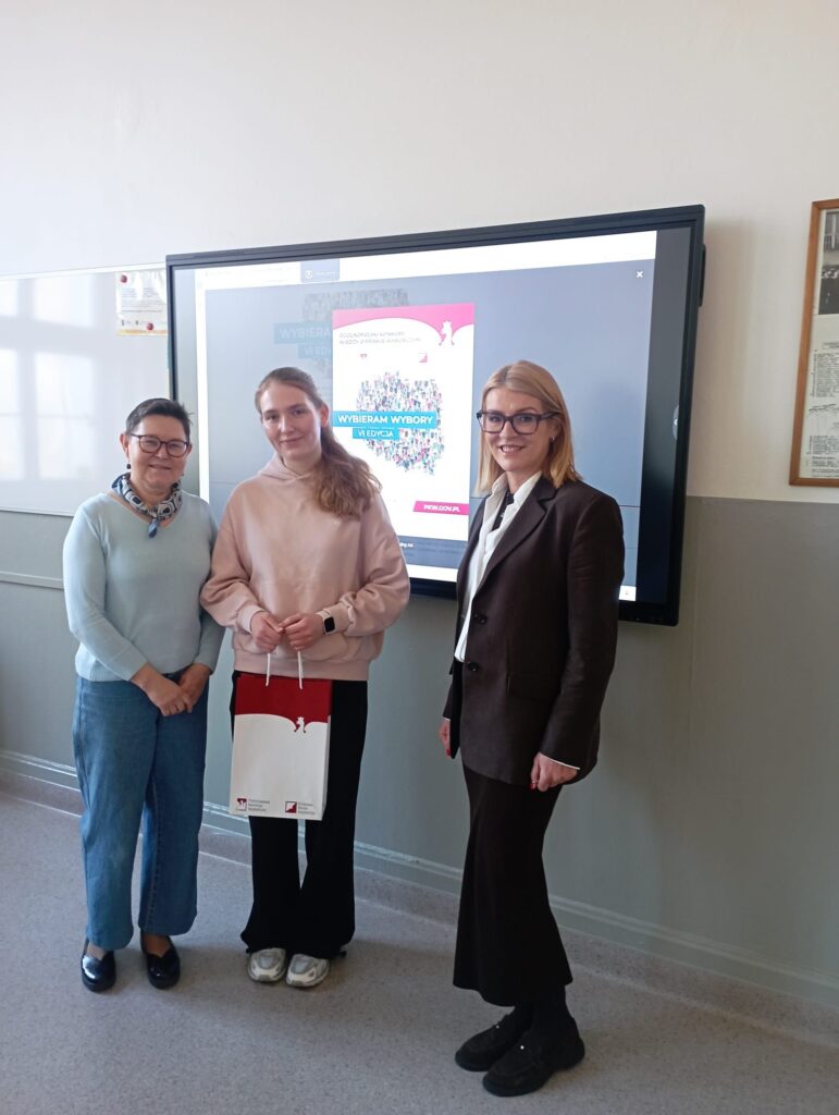 18 marca mieliśmy przyjemność gościć w szkole Panią Dyrektor Delegatury Krajowego Biura Wyborczego w Gdańsku Mirosławę Torłop, która wręczyła nagrodę (pakiet materiałów maturalnych z wosu i matematyki) Paulinie Kalkowskiej z 3a. Jest to nagroda rzeczowa za uzyskanie tytułu laureatki etapu wojewódzkiego VI edycji Ogólnopolskiego Konkursu Wiedzy o Prawie Wyborczym “Wybieram Wybory”. W czasie rozmowy okazało się, że Pani Dyrektor jest absolwentką naszej szkoły.