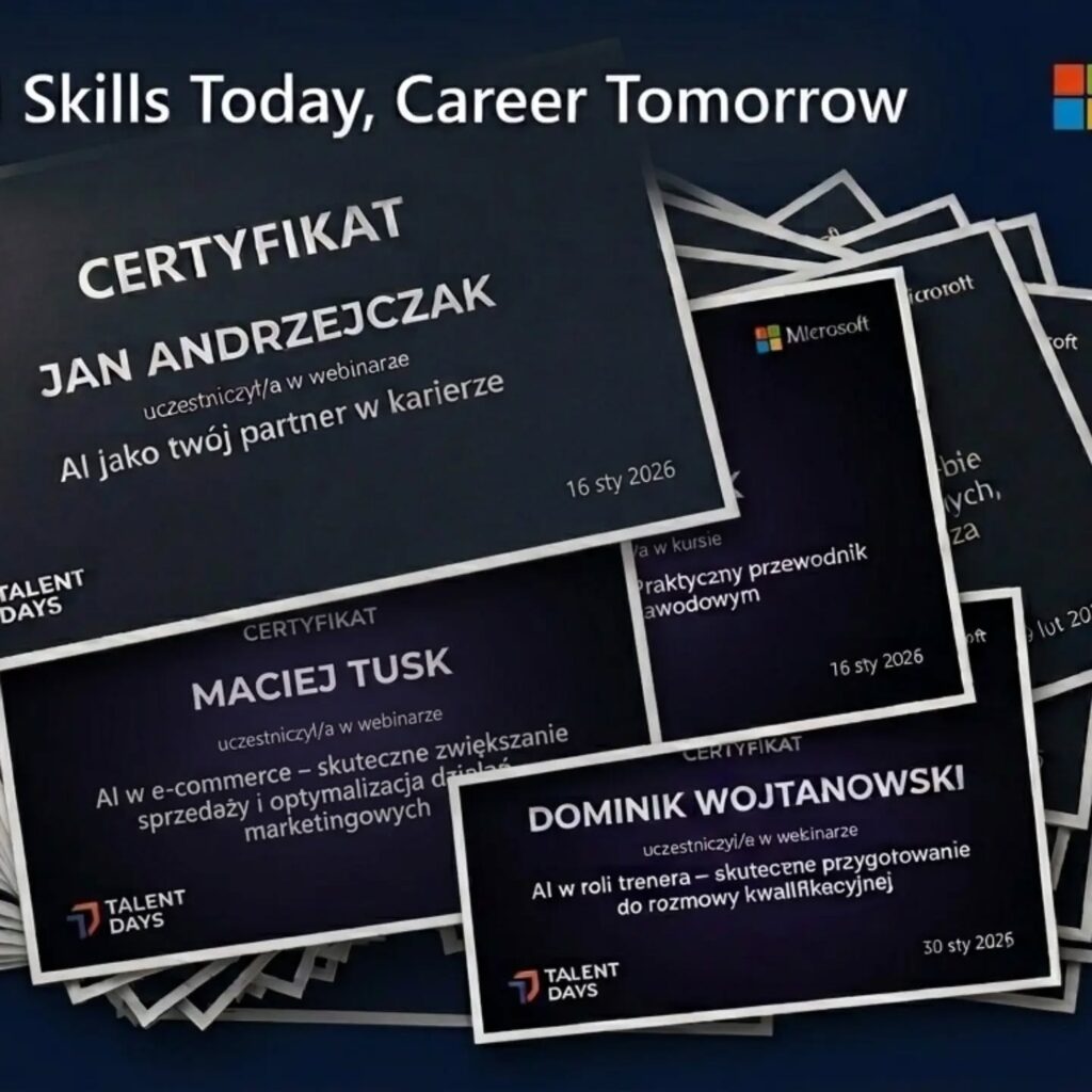 Nagrodę indywidualną w wysokości 2000 zł zdobyła Milena Myga z klasy 4b. Jury doceniło jej trafne, kreatywne odpowiedzi oraz wizjonerskie podejście do roli sztucznej inteligencji w przyszłej karierze zawodowej. Choć zwycięzca jest jeden, to każdy z naszych uczniów jest wygranym. Zdobyte certyfikaty i kompetencje w obszarze Microsoft AI to realna przewaga na rynku pracy.